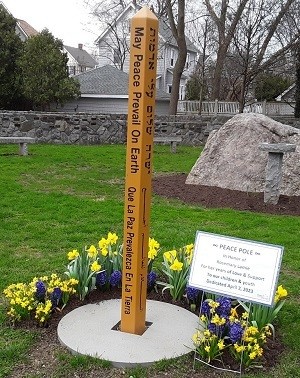 The Columbarium (cremations only) still has plots available. In early 2023, a Peace Pole was placed in the center of the Columbarium as a tribute to staff member Rosemary Lamie upon her retirement after about 20 years here. Thanks to Peter Grunow for the spring flowers around it.